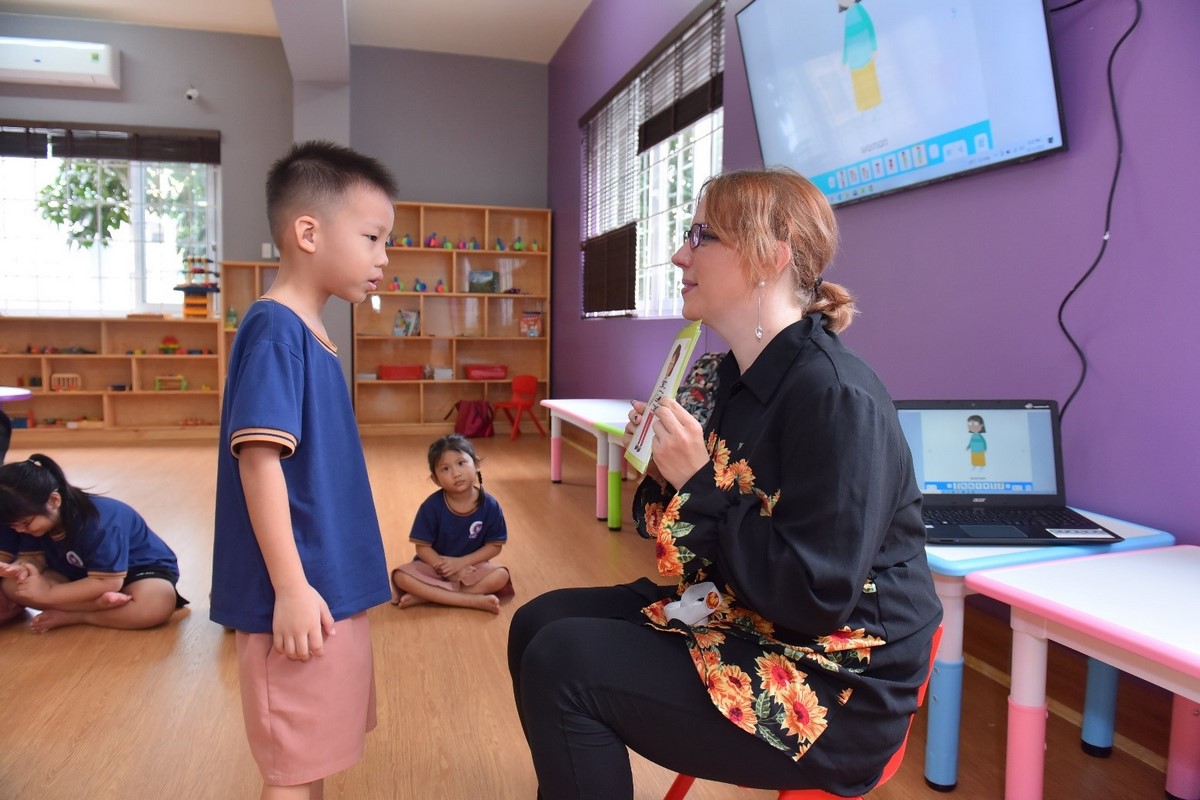 Giao tiếp Tiếng Anh với giáo viên người nước ngoài (Anh, Mỹ) bước đầu hình thành nền tảng kỹ năng Tiếng Anh chuẩn trong độ tuổi vàng (từ 3 đến 6 tuổi) về phát triển tư duy, ngôn ngữ.