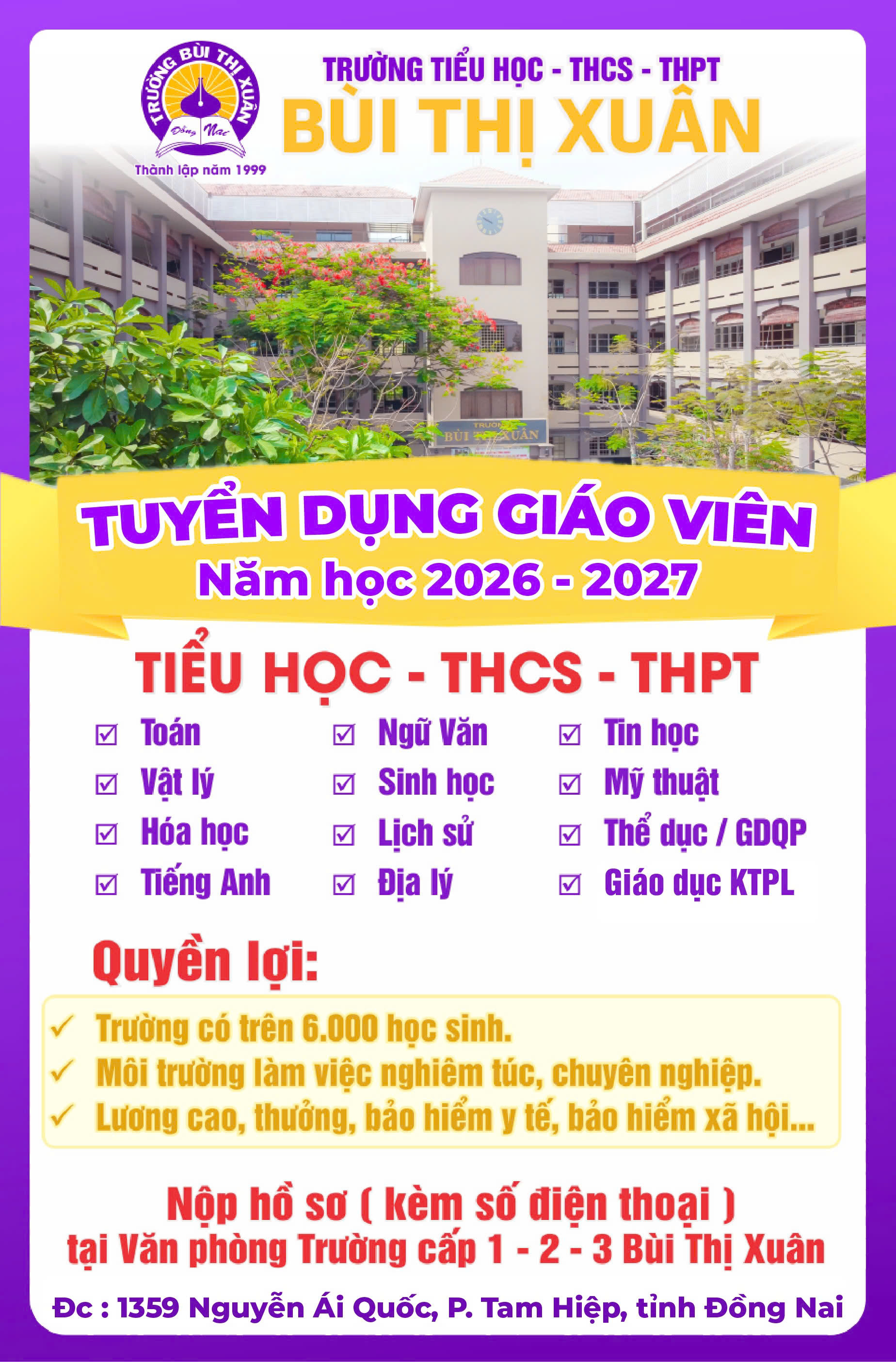 TRƯỜNG BÙI THỊ XUÂN THÔNG BÁO TUYỂN DỤNG NĂM HỌC 2026 - 2027.
